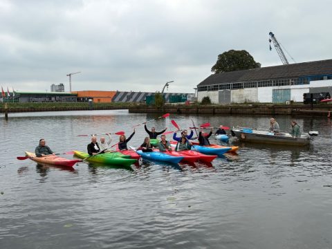 Na de lunch ging het programma richting het water. Een deel van de groep vertrok lopend naar de Industrieweg om te gaan kajakken, terwijl Laura en Marieke kozen voor een elektrisch bootje vanaf de Harm Smeengekade. Die twee verschillende manieren om dezelfde groene stadsgracht te beleven, konden goed gecombineerd worden. Ondanks het rustige weer en kalme water zijn er toch een paar Trigonisten soepie nat geworden in de kajak.